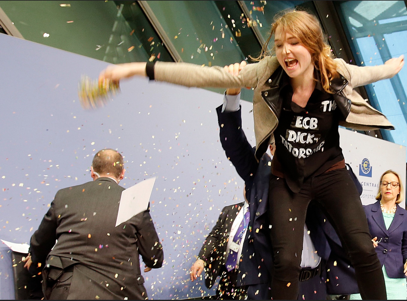 Quando una manifestante ha scalato la piattaforma occupata dal presidente della BCE, Mario Draghi, durante la sua conferenza stampa mensile nel mese di aprile, l’italiano, di solito imperturbabile, è rimasto comprensibilmente paralizzato dalla paura. Di fronte all’attivista che gridava di “porre fine alla dittatura della BCE”, Draghi è stato coperto da una pioggia di volantini con un elenco di rudimentali minacce, che accusavano la banca centrale di “egemonia autocratica” e Draghi di essere un malefico “padrone dell’universo”.