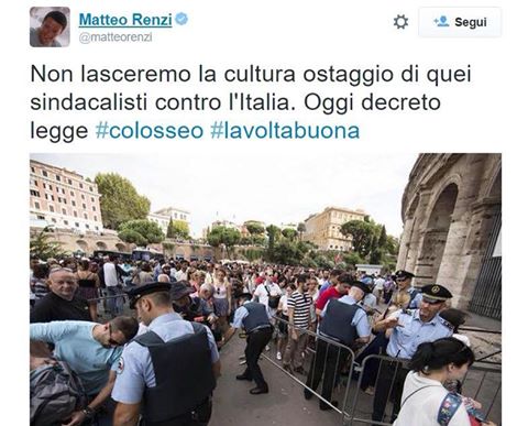 1. Con tutto il rispetto per la cultura. Con tutto il rispetto per l’arte. Con tutto il rispetto per i beni storici e ambientali italiani… I diritti dei lavoratori sono sanciti: dalla Costituzione, dagli Statuti e dai Contratti collettivi. Fare carta straccia di tutto ciò è un’azione autoritaria, degna di regimi poco democratici. Il prossimo che mi viene a dire che il PD e “matteuccio da firenze” fanno politica di SINISTRA (per definizione PROGRESSISTA e SOLIDALE) me lo mangio. Nemmeno la più becera destra avrebbe osato tanto.