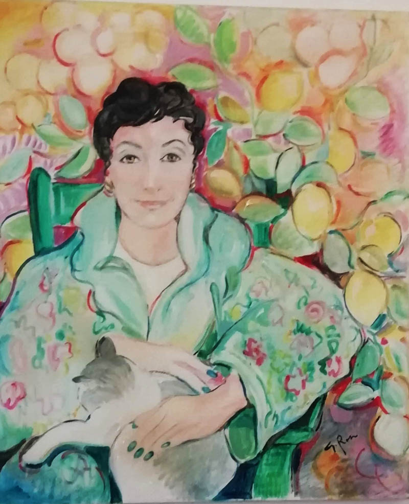 1. La mise è orientaleggiante, ma l’espressione enigmatica è di una lady, l’ambientazione pare quella di una pianta di limoni ben carica di frutti, il gatto sembra che ci si voglia accoccolare sulle gambe… si, sei tu querida: le unghia di blu dicono del mare e della volubilita del tuo esser donna!