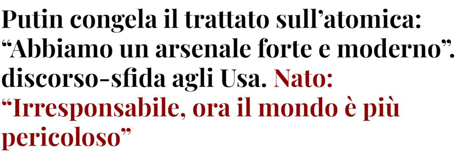 Mavvà Stoltenberg te lo dicevo io che a son di insultare e provocare saremmo finiti male, ma tu, l’Alzheimer e il nano tragicomico afflitto da un raffreddore perenne da neve…niente, avanti con attacchi sempre più sgangherati,ieri avete dato il massimo in quel di kiev, mes compliments. Purtroppo ad avere il pubblico coraggio di andar contro un pensiero unico devastante siamo in pochi… ah un avviso affettuoso anche alla FiammA TricolorE che sempre arde: mia cara dichiarare al Zelè, dopo il bacio senza disinfezione: ” L’Italia è con Kiev fino alla fine” mi obbliga a volgarissimi scongiuri, sai la fine non vorrei fosse la nostra,bisogna che scriva a VLAD per smarcami , magari se mi avvisa volo in Tasmania, perché io i Diavoli li amo 😀 😀 😀